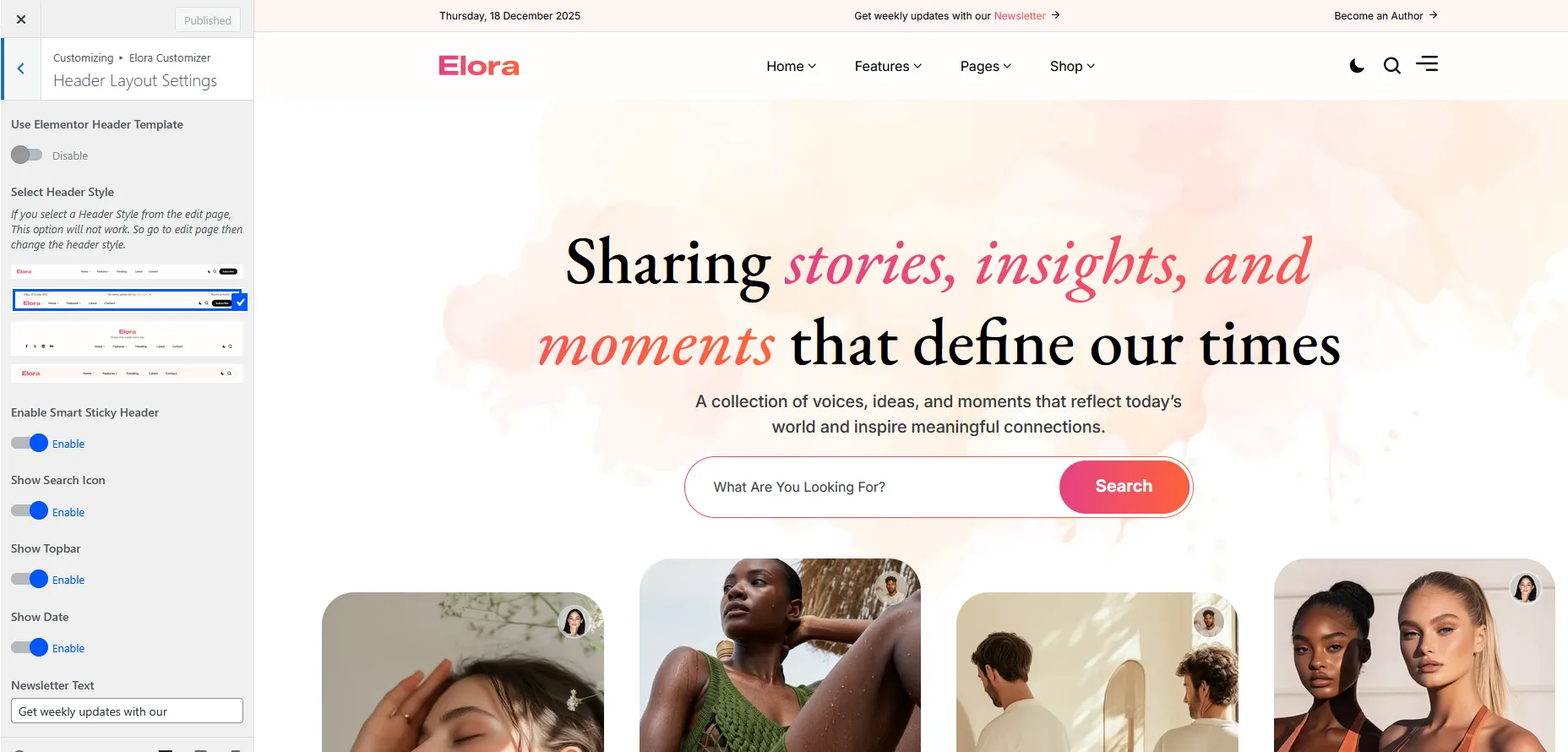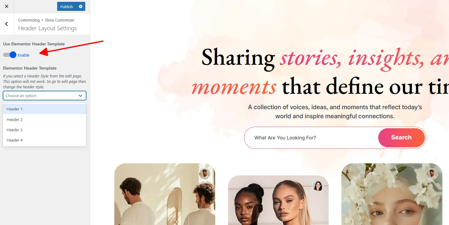 Elora Customizer → Header Layout Settings → Select Header Style Globally