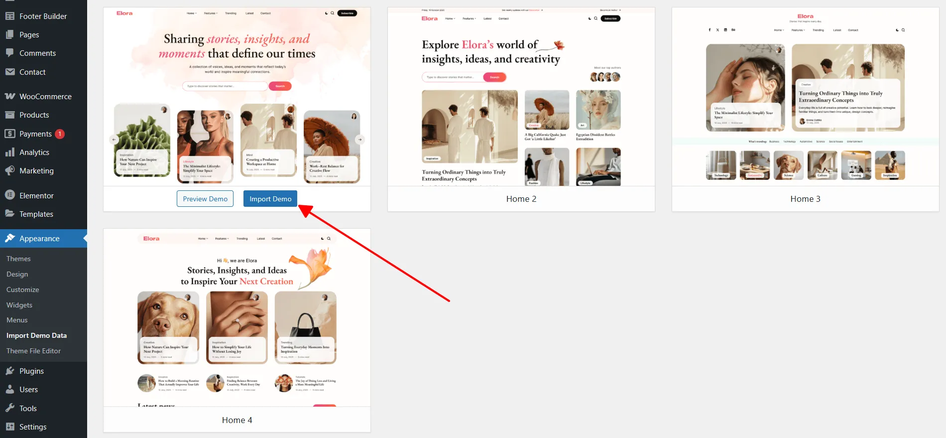If you want to have a website exactly like our demo ( https://elora.alithemes.net ) please go to Appearance -> Import Demo Data.