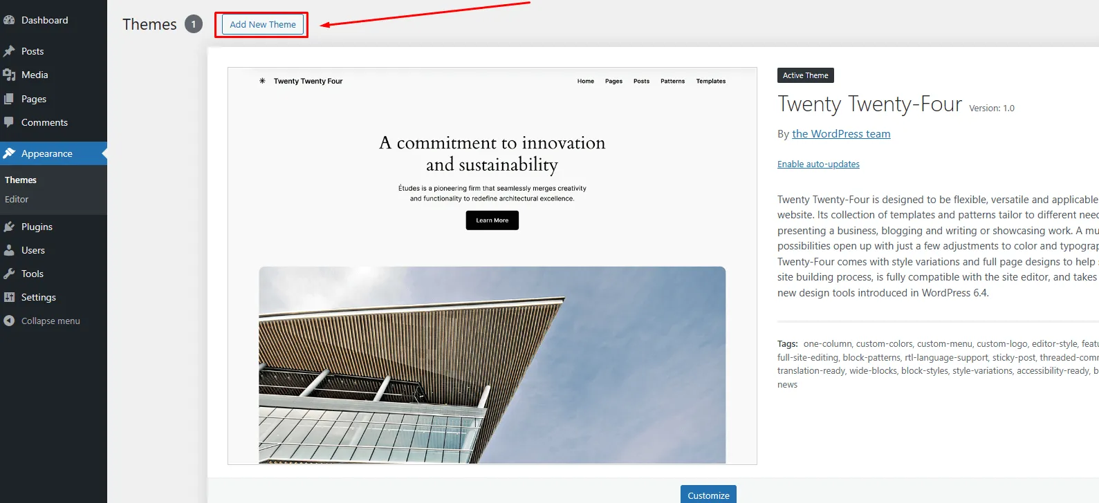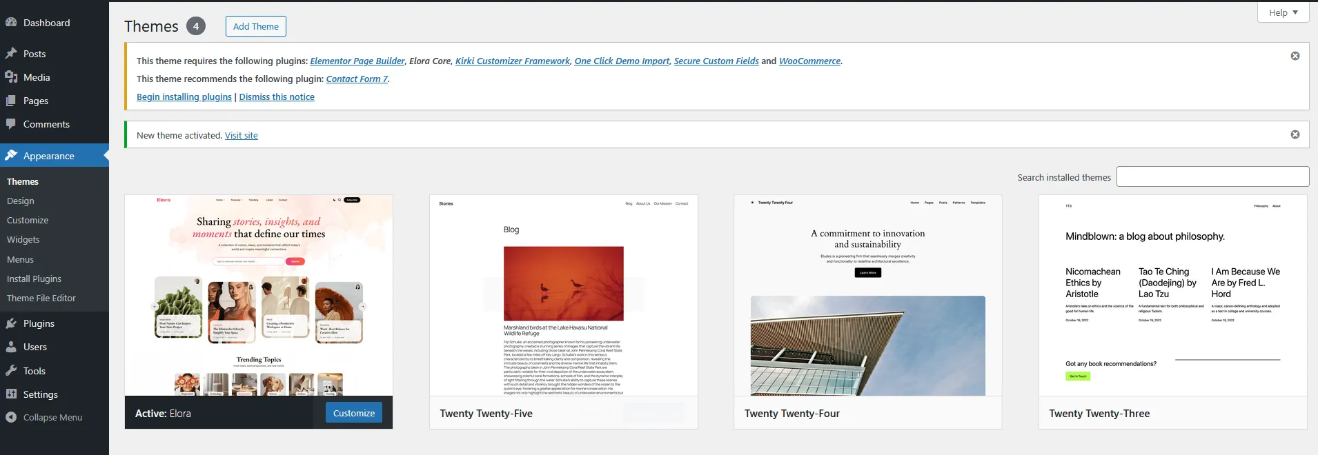 Once uploaded, activate the theme by heading to the “Themes” menu in the WordPress Dashboard. Locate the Elora Theme and hit “Activate”.