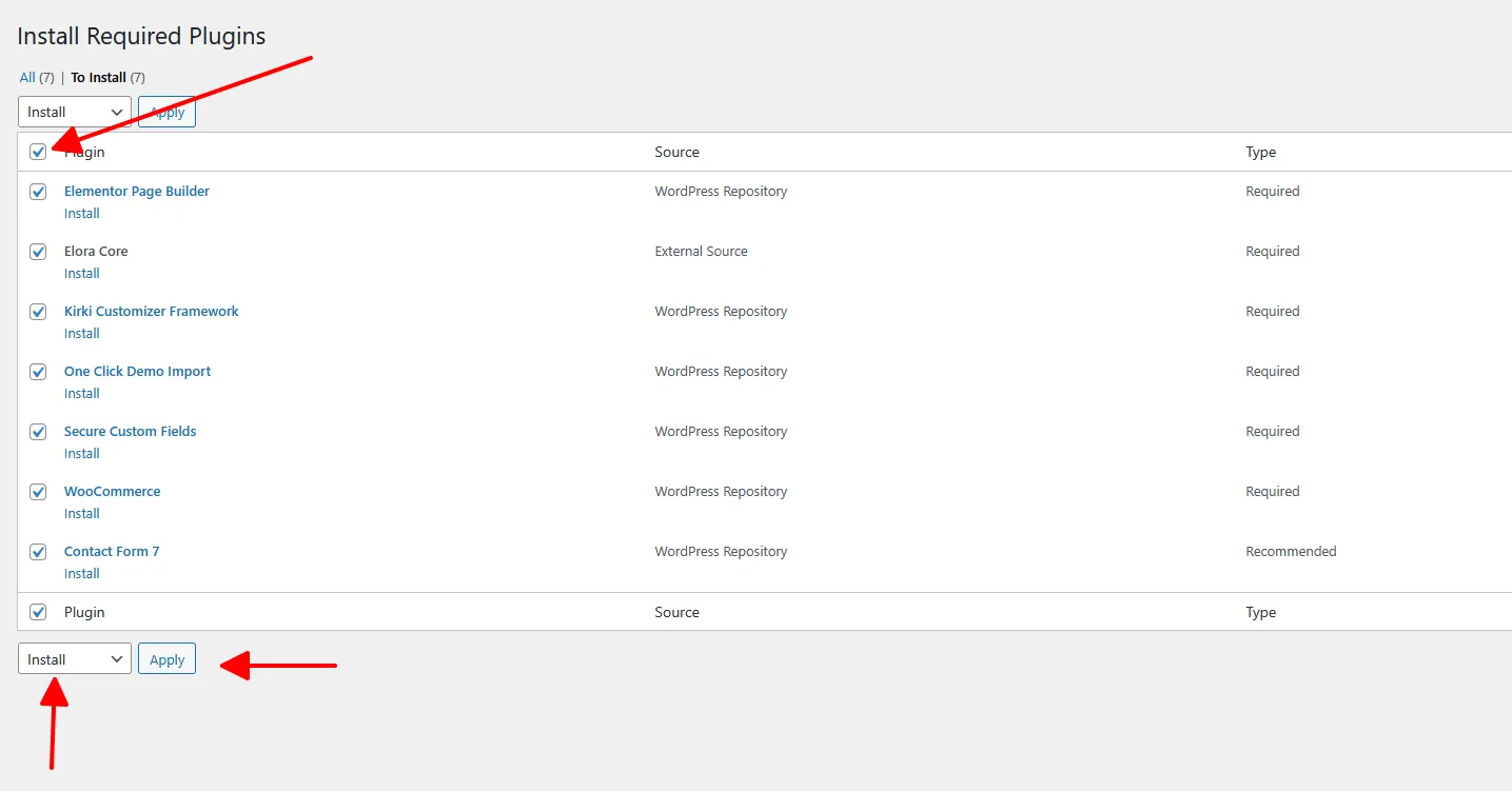 Select all plugins → Choose Install → Click Apply.
