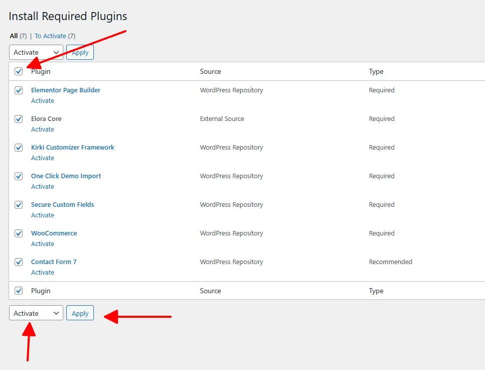 Select all plugins -> Choose Activate -> Click Apply.